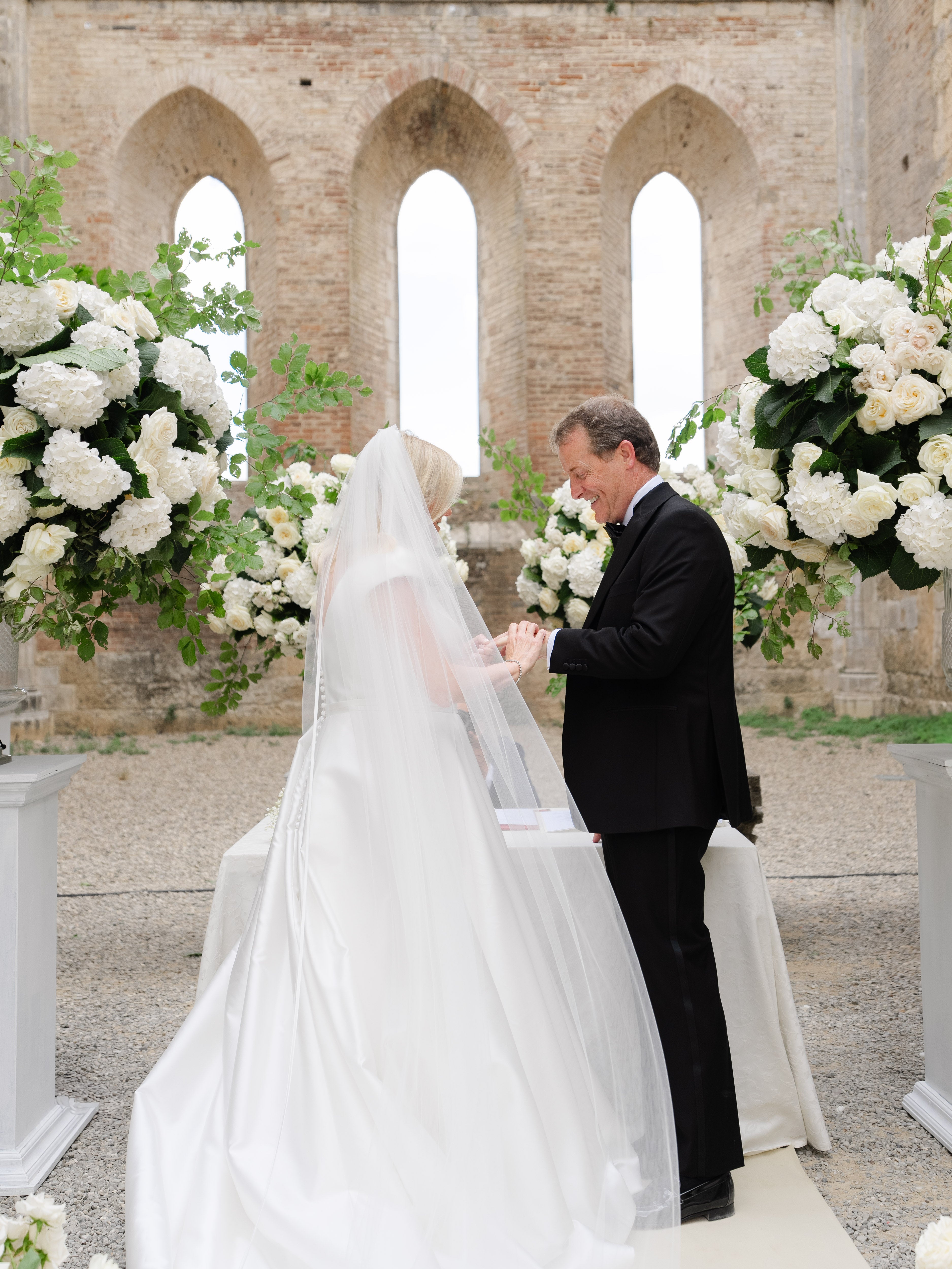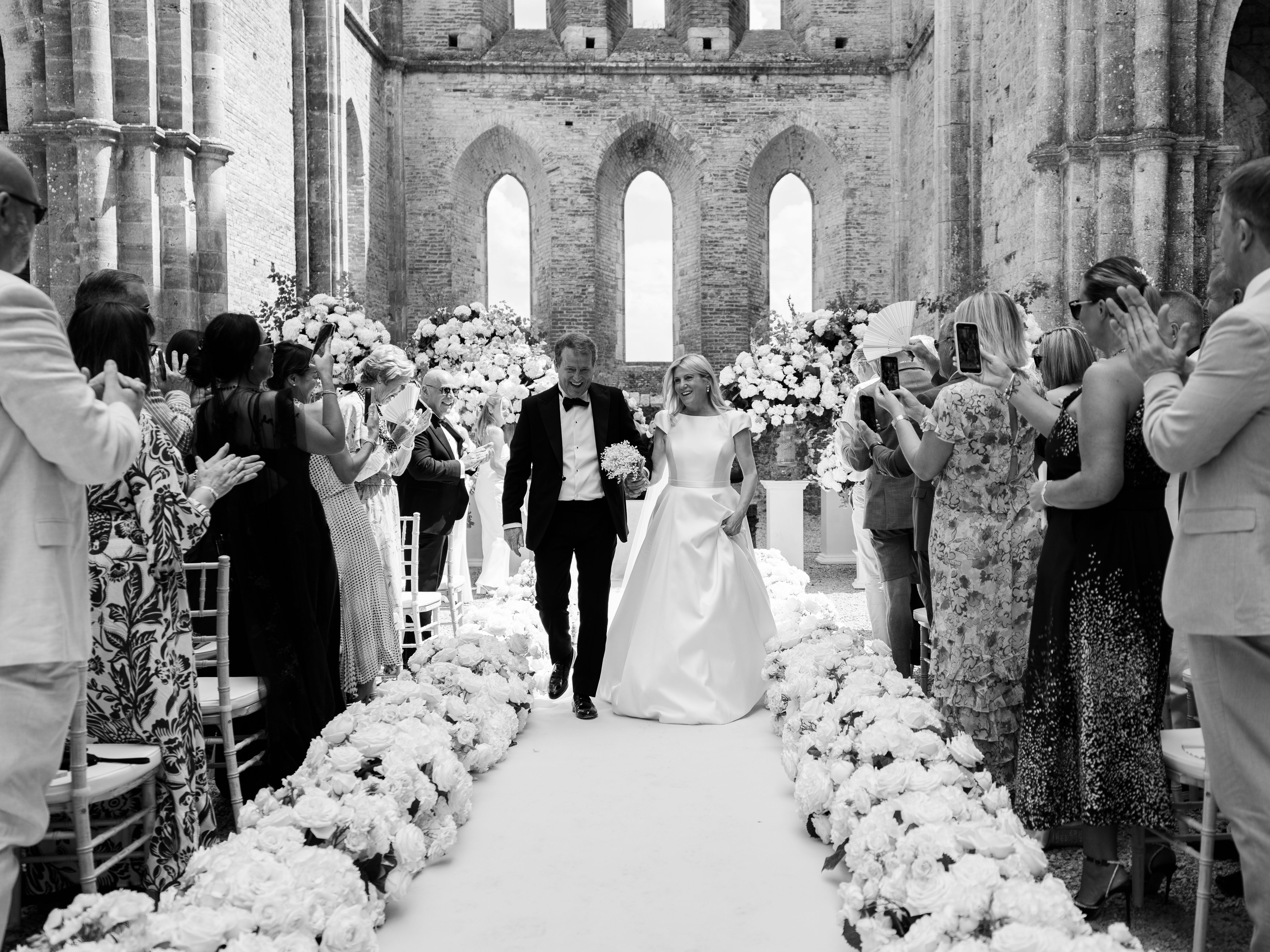 Sarah and Robert’s celebration was nothing short of extraordinary. They exchanged vows at the iconic roofless church of San Galgano before gathering at Borgo Santo Pietro, one of Tuscany’s most exclusive venues. From the sun-drenched ceremony to the enchanting reception under star-filled skies, every moment felt like a dream. We were honored to capture it all—both in photography and video—preserving the heartfelt laughter, the refined details, and the indescribable magic of their days.